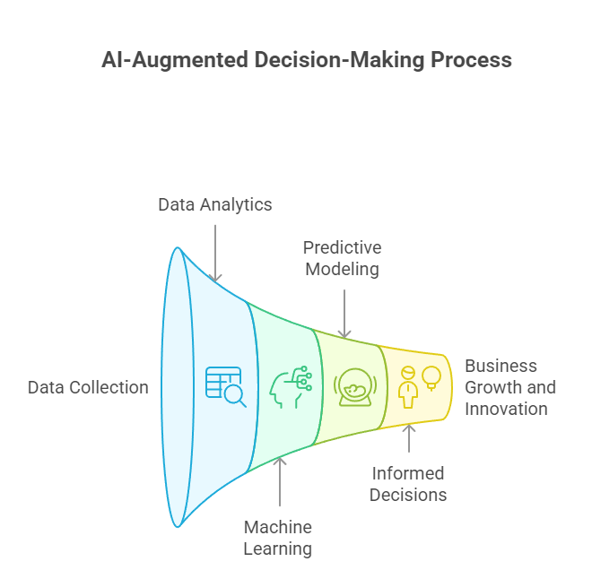 The Strategic Alignment layer connects AI-augmented decisions to organizational objectives, risk appetite, and sustainability goals. This ensures that AI is not simply solving isolated problems but is actively driving the company’s mission and long-term growth. By aligning AI recommendations with key performance indicators (KPIs), businesses can measure their effectiveness and ensure compliance with ESG (Environmental, Social, and Governance) responsibilities. Dashboards and performance monitoring systems translate AI insights into meaningful business outcomes. This layer is critical for achieving buy-in from leadership and ensuring that AI initiatives remain relevant to stakeholders at all levels of the organization.