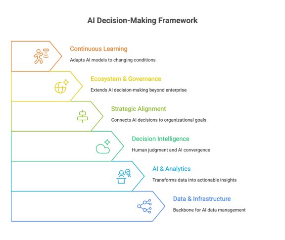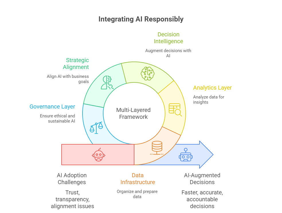Artificial Intelligence (AI) is reshaping the way businesses operate, driving efficiency, accuracy, and innovation in decision-making processes. Yet, many organizations face challenges when it comes to trust, transparency, and alignment of AI outputs with strategic goals. To address these challenges, the Multi-Layered Framework provides a comprehensive roadmap for integrating AI responsibly and effectively into business ecosystems. By structuring AI adoption across layers—data infrastructure, analytics, decision intelligence, strategy, and governance—this framework helps organizations bridge the gap between technology and business value. In doing so, it empowers leaders to make AI-augmented decisions that are not only faster and more accurate but also accountable, ethical, and sustainable.